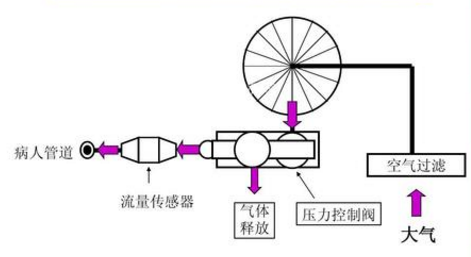 流量傳感器將測量到的實際值饋送到電子控制部分與面板設(shè)置值比較,利用兩者間的誤差控制伺服閥門來調(diào)節(jié)吸入和呼出氣體流量;