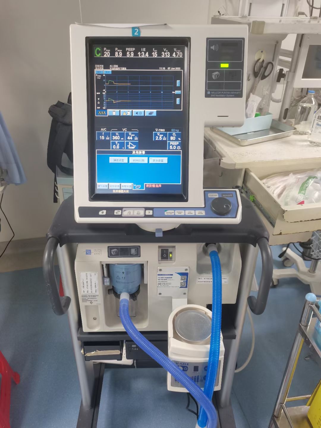 (5) 呼吸機(jī)接上病人,在上半屏幕的頂部會(huì)顯示呼吸機(jī)檢測(cè)到的病人數(shù)據(jù),呼吸機(jī)所有的設(shè)置值將在下半屏幕顯示。